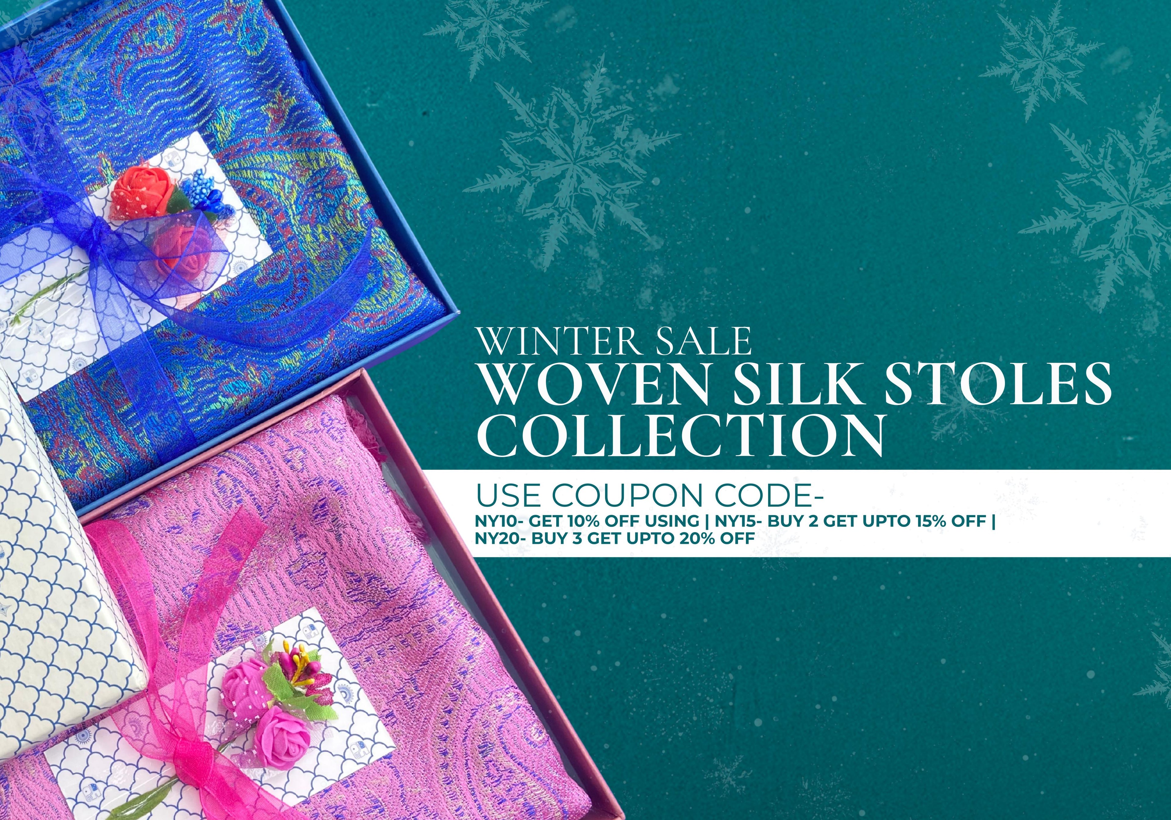 OMVAI Ornamental Paisley Premium Woven Silk Stole - Blue