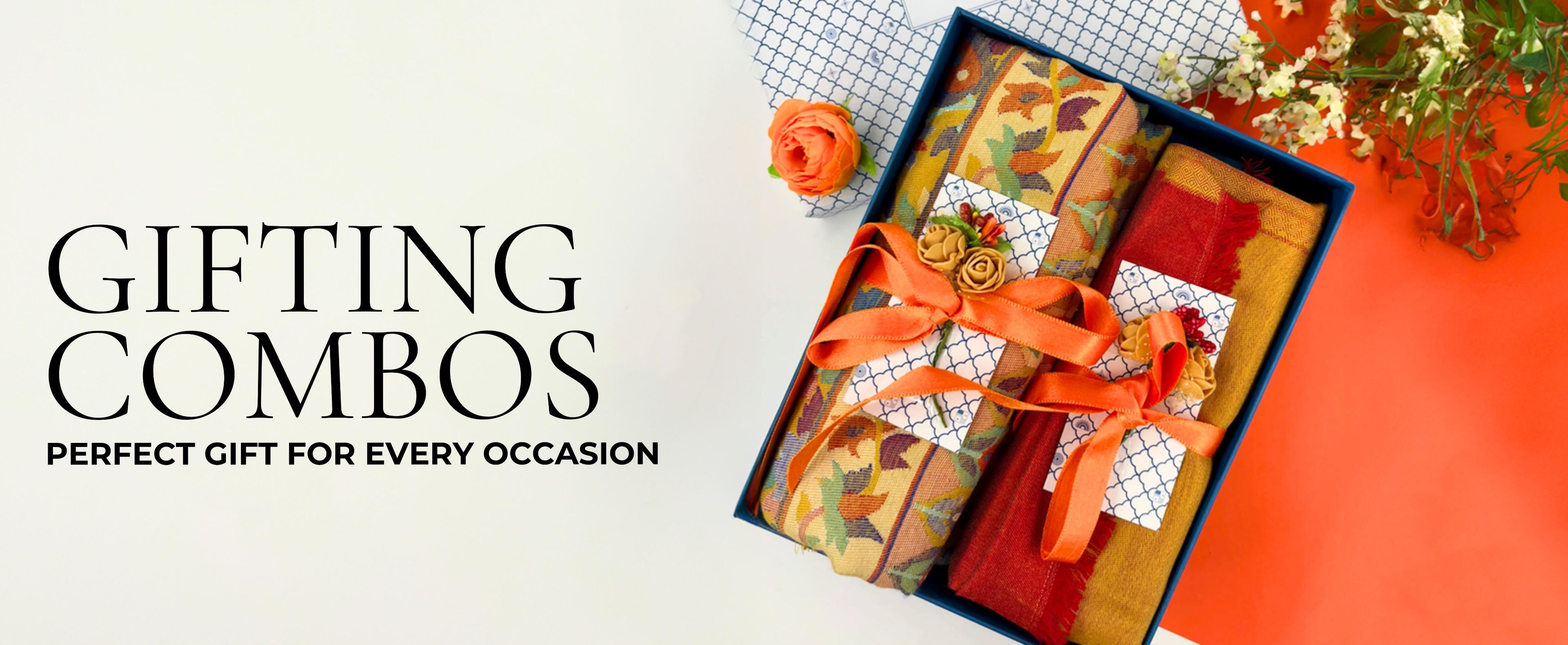 OMVAI Ladies Stole Combo Gift Set in Ochre Kani and Reversible Modal in Fine Quality (Set of 2) - For HIM and for HER